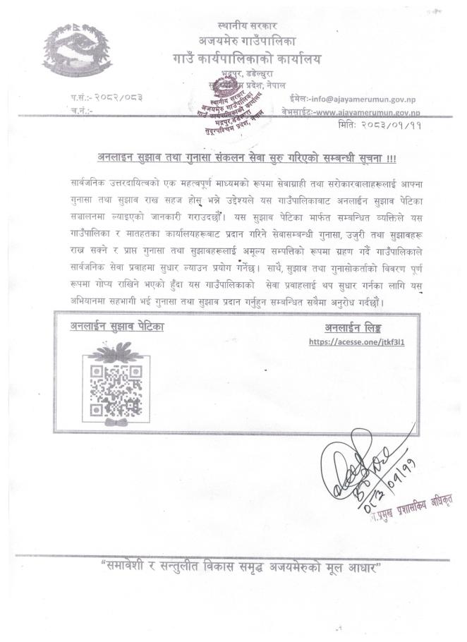 अनलाइन सुझाव तथा गुनासा संकलन सेवा सुरु गरिएको सम्बन्धी सूचना !!!