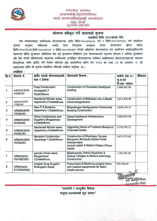 बाेलपत्र स्वीकृत गर्ने आशयकाे सूचना !!!