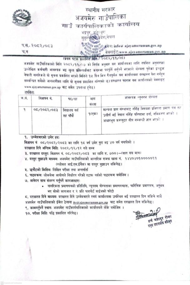 विद्यालय नर्स करार सेवामा पदपूर्ति गर्ने सम्बन्धि सूचना ।
